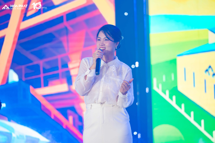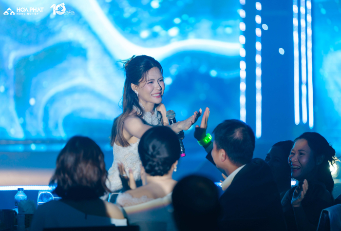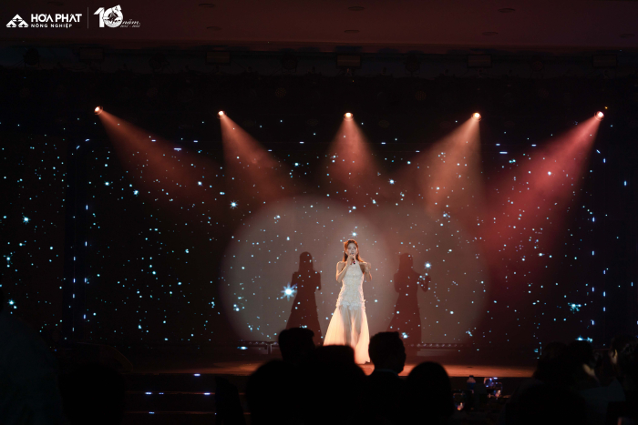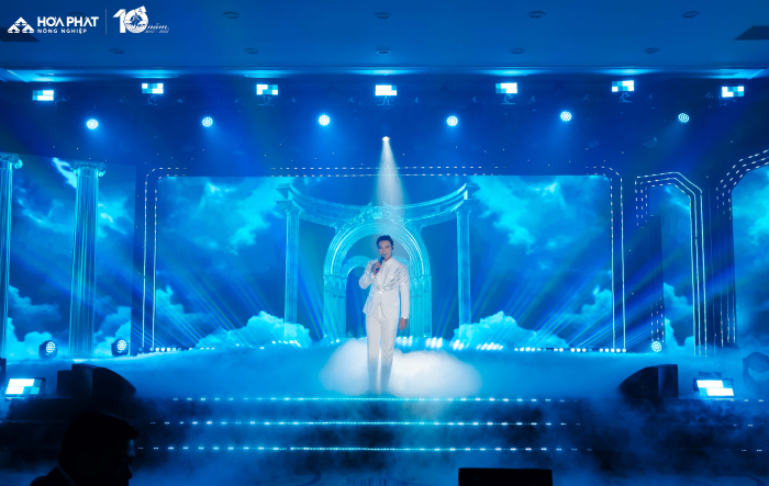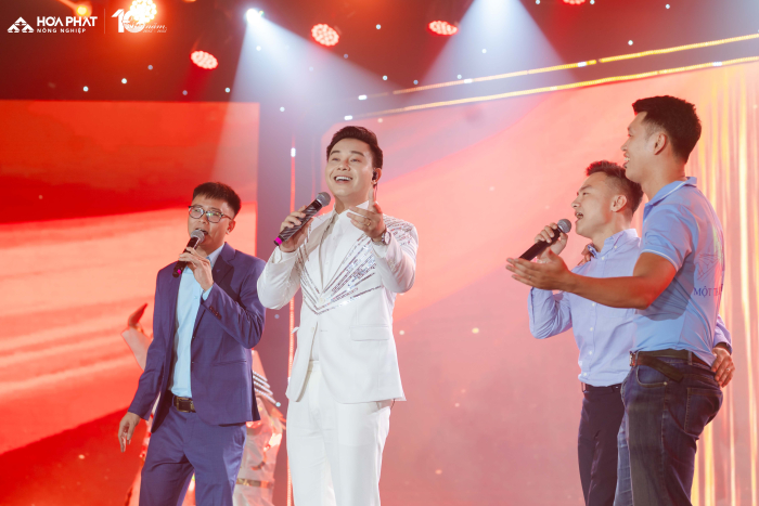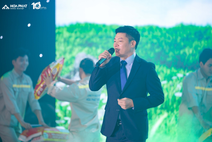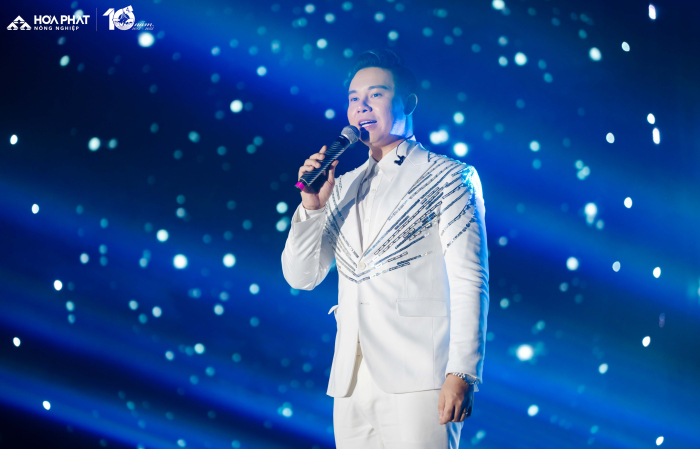 Bằng giọng ca nội lực và rất kỹ thuật, kết nối tinh tế với khán giả, Đông Hùng đã khéo léo tái hiện lại chặng đường 10 năm mà Nông nghiệp Hòa Phát đã đi qua
