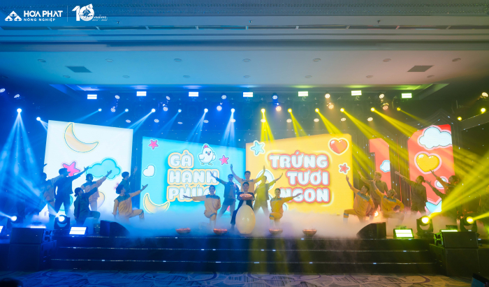 Sân khấu tiếp tục bừng sáng khi các vũ công với rổ trứng có viền LED lấp lánh và một quả trứng LED cỡ lớn tạo không gian trang trại Gà đẻ hạnh phúc nơi có sự đoàn kết, nhất tâm, đồng lòng của đội ngũ CBCNV. Họ cùng chăm sóc, nâng niu từng chú gà bé nhỏ để “Cho ra những khay trứng sạch tươi” vừa đảm bảo dinh dưỡng, an toàn, tươi ngon, bổ dưỡng là thành quả có được từ “Gà hạnh phúc - trứng tươi ngon” của Công ty Gia cầm Hòa Phát.