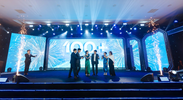 Khoảnh khắc các lãnh đạo cùng đặt tay lên màn hình LED, ghi dấu hành trình 10 năm phát triển "chuyển tải những nguồn năng lượng" để chào đón "một thập kỷ tạo chất" tiếp theo