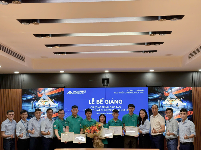 Công ty Phát triển chăn nuôi Hòa Phát vừa tổ chức lễ bế giảng khóa đào tạo kỹ thuật chuyên sâu khóa III, khép lại chương trình đào tạo kéo dài sáu tháng dành cho đội ngũ kỹ thuật kế cận của hệ thống trang trại.
