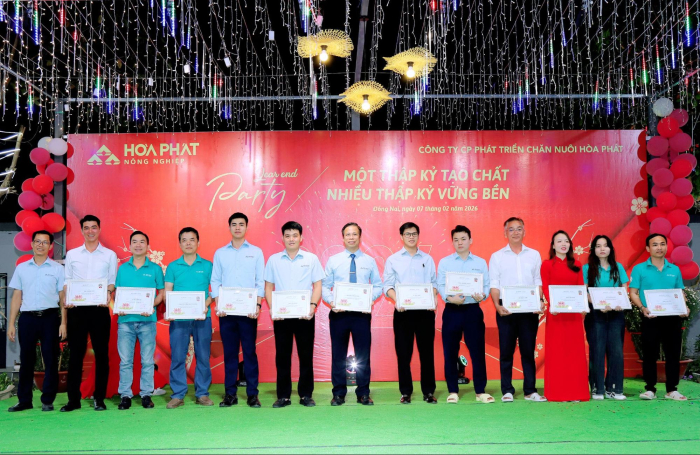 Mở đầu chương trình, đại diện Ban Giám đốc phát biểu khai mạc. Toàn bộ hội trường cùng xem MV ca nhạc ghi lại hành trình 10 năm của Công ty, từ những trại đầu tiên đến quy mô hệ thống như hiện nay. Tiếp theo là lễ trao kỷ niệm chương thâm niên cho cán bộ nhân viên gắn bó từ 5 năm trở lên và các cấp quản lý từ C2 đến C10. Giải thưởng cuộc thi viết "Chăn nuôi Hoà Phát trong tôi" cũng được trao trong sự kiên tất niên.