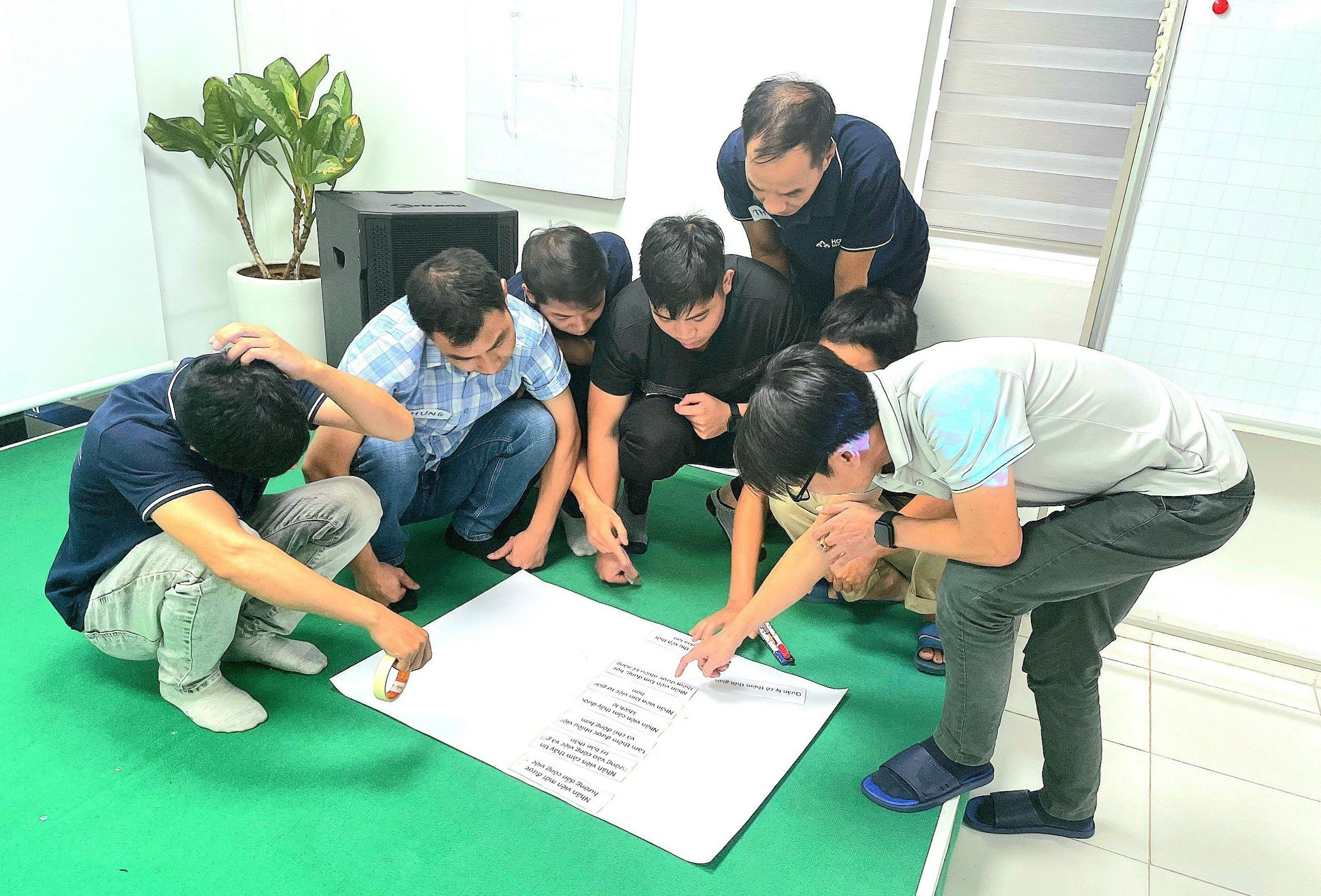 Trong phiên đào tạo buổi sáng, các anh chị học viên được chia thành 04 nhóm cùng thảo luận, cùng tương tác trực tiếp với nhau để sắp xếp sao cho hợp lý các cụm từ xoay quanh chủ đề nhân sự, cách thức làm việc và phát triển năng lực của nhân viên.
