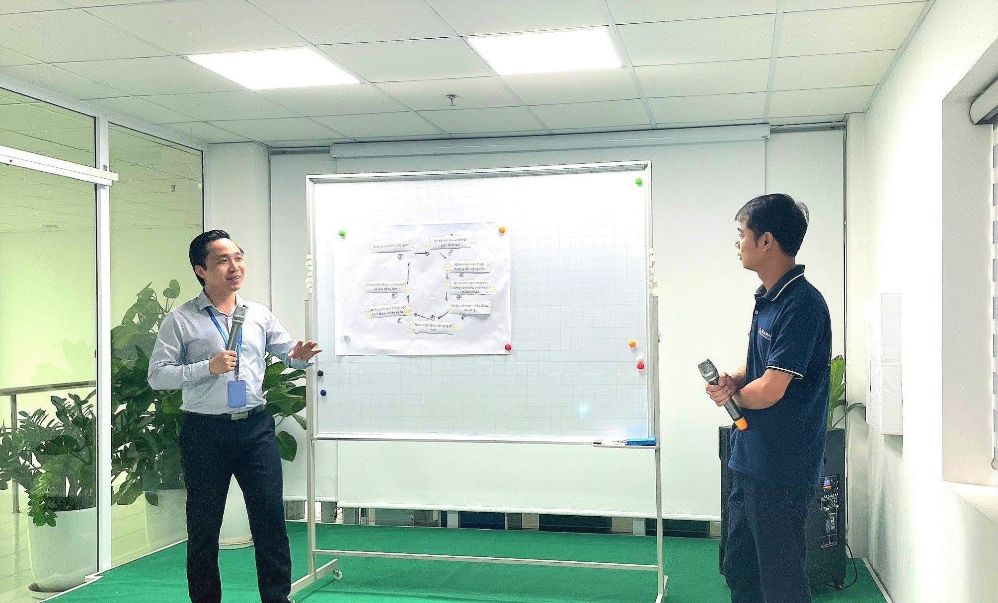 Sau đó, cứ hai nhóm thì sẽ cùng thuyết trình về một chủ đề, đó là: “Phương pháp phát triển nhân viên” và “Nếu thay đổi suy nghĩ chúng ta được gì?”. Sau 05 phút thảo luận riêng, mỗi nhóm cử đại diện lên thuyết trình và chia sẻ quan điểm từ ý tưởng của từng nhóm.