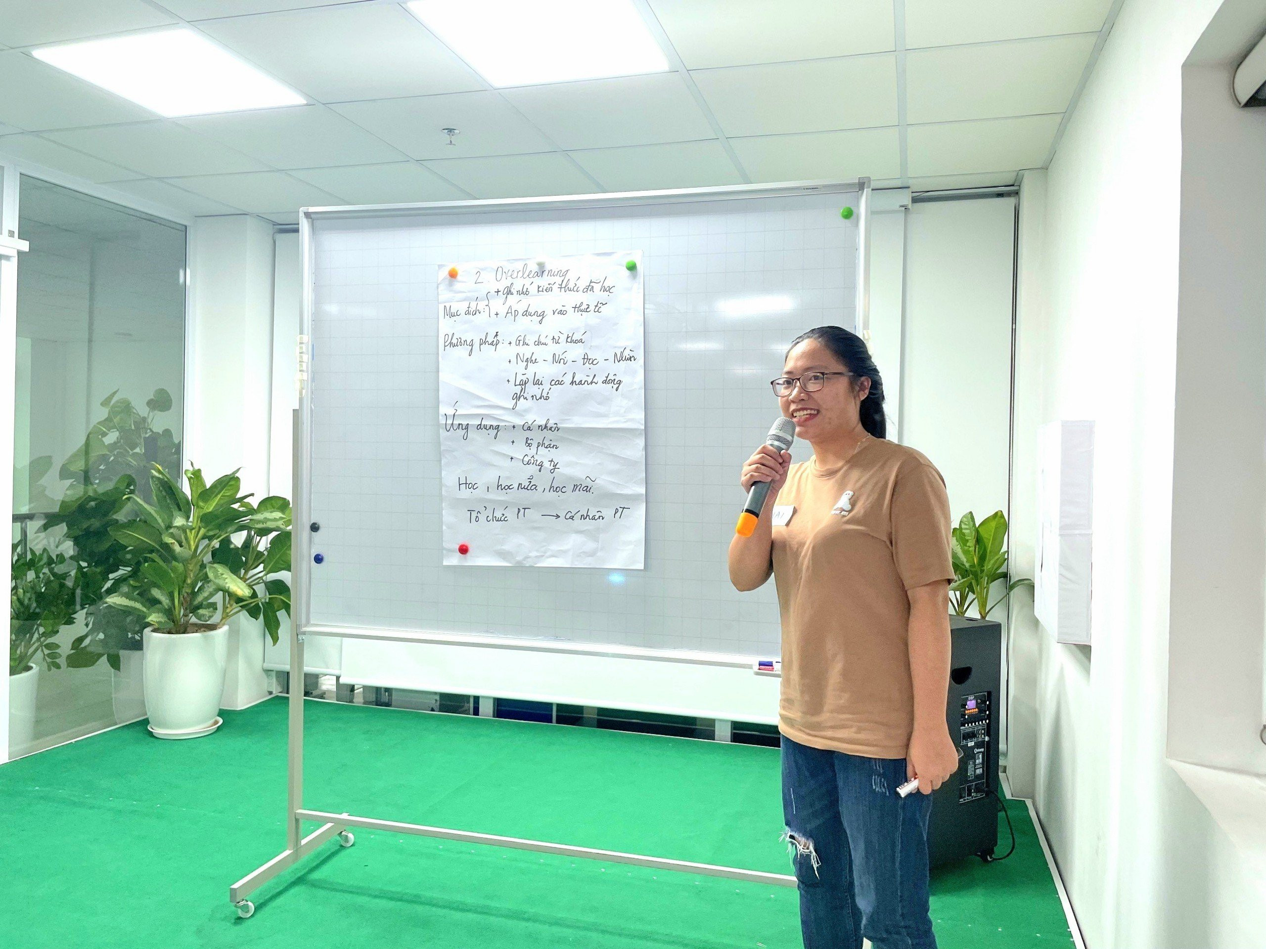 Phiên đào tạo buổi chiều bắt đầu với việc tìm hiểu về 08 nguyên tắc học tập của người trưởng thành. Lớp học tiếp tục chia thành 04 nhóm, mỗi nhóm nghiên cứu về một phương pháp học tập được mô tả chi tiết trong học liệu. Sau 10 phút chuẩn bị, đại diện các nhóm lên thuyết trình về những nội dung chính đã tổng hợp được. Chị Phạm Thị Mai - Nhân viên Phòng Kỹ thuật đại diện nhóm 1, thuyết trình về nguyên tắc học tập “Overlearning - Học đi học lại”.