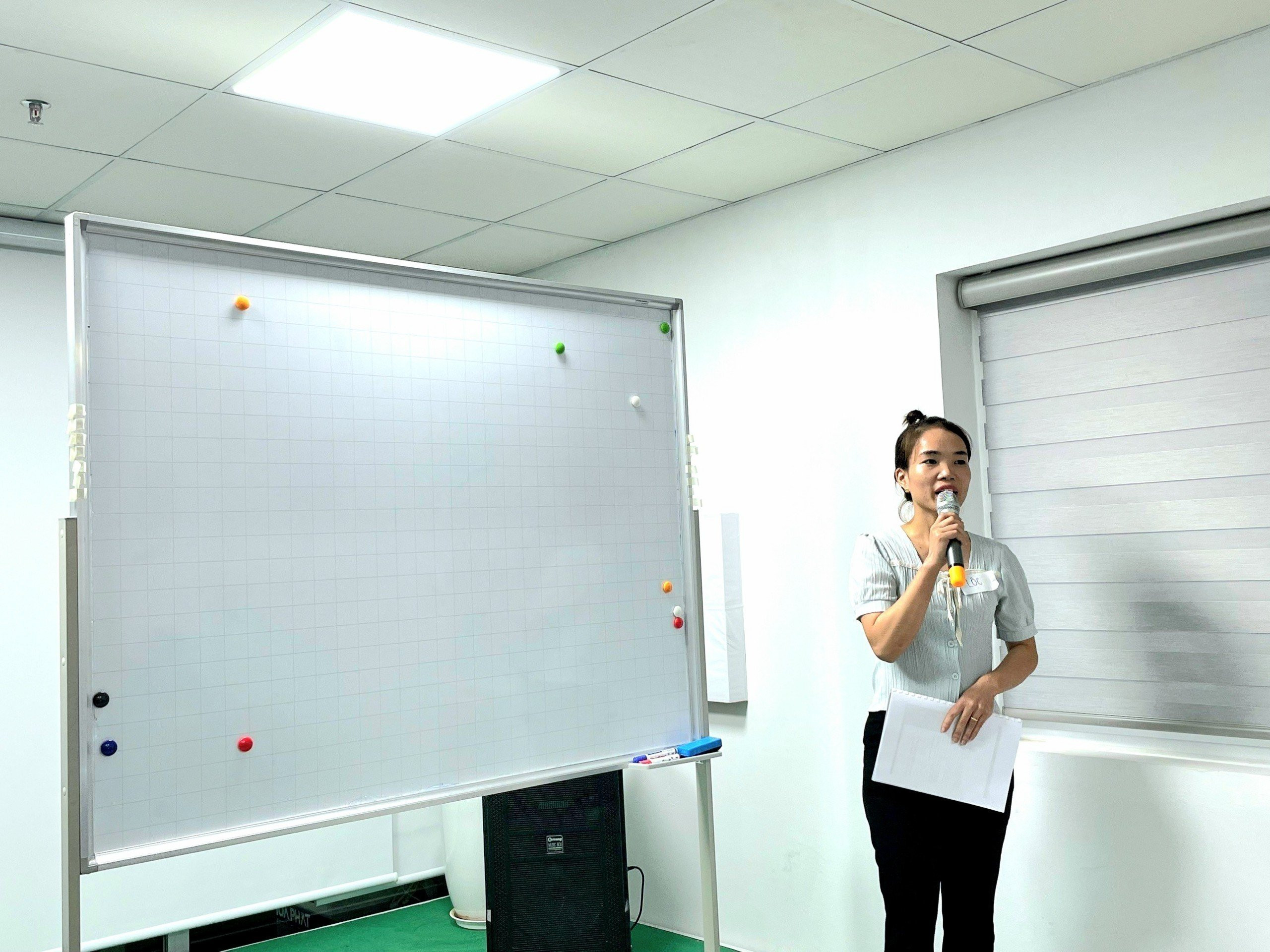 Chị Đỗ Thị Lộc - Thủ kho Vật tư máy lọc nước đại diện nhóm 2 thuyết trình về nguyên tắc học tập Primacy and Recency - “Đầu” và “Cuối”.Anh Bùi Huy Phi - Quản lý Kho thành phẩm đại diện nhóm 3 thuyết trình về nguyên tắc học tập “Reinforcement - Ghi nhận, khen ngợi và củng cố”