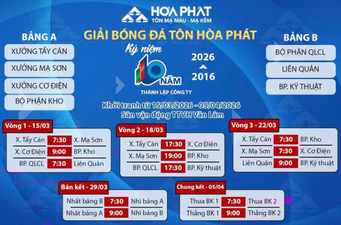 Mẫu áo của giải bóng đá kỷ niệm 10 năm Tôn Hòa Phát được lấy cảm hứng từ họa tiết kim cương kết hợp hài hòa cùng logo 10 năm của Công ty, thể hiện sự phát triển bền vững và giá trị của doanh nghiệp hàng đầu trong ngành tôn mạ tại Việt Nam.Lễ khai mạc giải đấu sẽ diễn ra vào 7:30 sáng ngày 15/3/2026 tại Sân vận động TTVH Văn Lâm, tỉnh Hưng Yên. Mở màn là cuộc đối đầu không khoan nhượng tại bảng A giữa 2 đội bóng thuộc 2 bộ phận đông đảo nhất Công ty là: Xưởng Tẩy Cán và Xưởng Mạ Sơn. Trong khi đó, cặp đấu còn lại là cuộc so tài đầy duyên nợ giữa Xưởng Cơ Điện và Bộ phận Kho. Hai đội bóng này đã gặp nhau ở trận ra quân ở cả 3 mùa giải trước và đây là lần thứ 4 liên tiếp hai đội chạm trán nhau ngay vòng đấu đầu tiên.