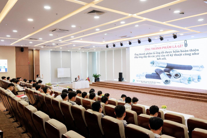 Chương trình cũng đi sâu vào việc nhận diện các tiêu chuẩn đầu bấm phổ biến trên thị trường như DIN, JIC, BSP, SAE. Đây là nội dung mang tính chuyên môn cao nhưng lại vô cùng cần thiết, bởi sự khác biệt nhỏ giữa các tiêu chuẩn có thể gây ra sai lệch lớn trong quá trình lắp đặt và vận hành. Thông qua việc phân tích cụ thể từng loại đầu nối, kết hợp hình ảnh minh họa và ví dụ thực tế, học viên có thể dễ dàng ghi nhớ và áp dụng vào công việc hàng ngày.