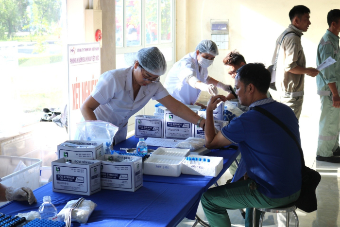 CBNV thực hiện lấy máu xét nghiệmKhám sức khỏe định kỳ là hoạt động thường niên thể hiện sự quan tâm của Hòa Phát Hải Dương đối với người lao động. Việc kiểm tra sức khỏe không chỉ giúp CBCNV nắm rõ tình trạng của bản thân mà còn giúp công ty có cơ sở điều chỉnh môi trường làm việc, bố trí nhân sự hợp lý, đảm bảo sản xuất an toàn và bền vững.