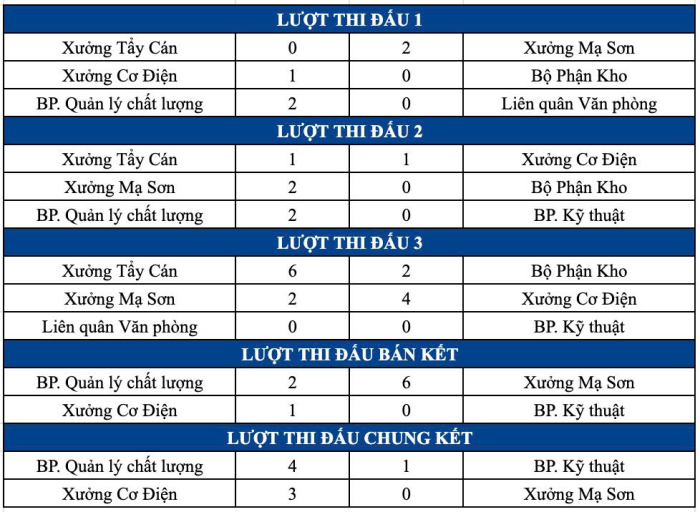 Khép lại trận đấu, BP. QLCL giành hạng Ba với lối chơi tấn công, cống hiến và tinh thần thi đấu tích cực. Trong khi đó, BP. Kỹ thuật để lại dấu ấn với tinh thần thi đấu bền bỉ của các cầu thủ giàu kinh nghiệm như Quang Nam, Thế Nghĩa và Việt Anh.